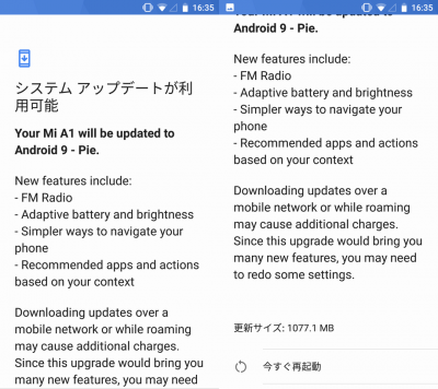 Android One 端末なので、アプデが早いハズだったんですが、しばらく Android 9 な Pie は降ってきませんでした。