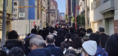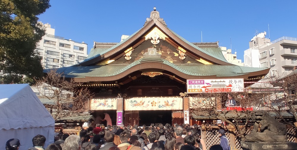 昨年の川崎大師ほど混雑しないだろうと思って行ってみた湯島天神。三組坂下まで迂回しての大行列。上の写真は並び始めてすぐ、三組坂下のガソリンスタンド横あたり。実は学生時代にこの近辺で仕事していたので、土地勘はある。・・・のでこの先長いな・・・と早くも戦意(?)喪失。