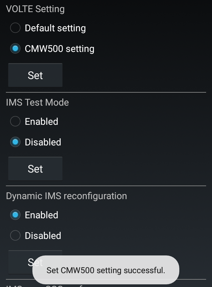 沢山あるメニューの中で、VOLTE Setting は Default setting が選択されていると思うので、CMW500 setting を選んで Set ボタンを押します。
