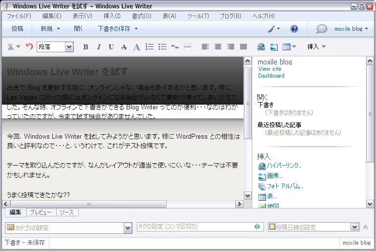 今回、Windows Live Writer を試してみようかと思います。特に WordPress との相性は良いと評判なので・・・と、いうわけで、これがテスト投稿です。