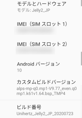 デバイス情報の一部をみますと・・・ちゃんと Android 10 ですね。11 にはなるのかしら? モデルを見ると、Jelly2_JP となっていて、FeliCa が使える H/W な部分だけでなく、S/W としても日本モデルになっているのが素晴らしいです。