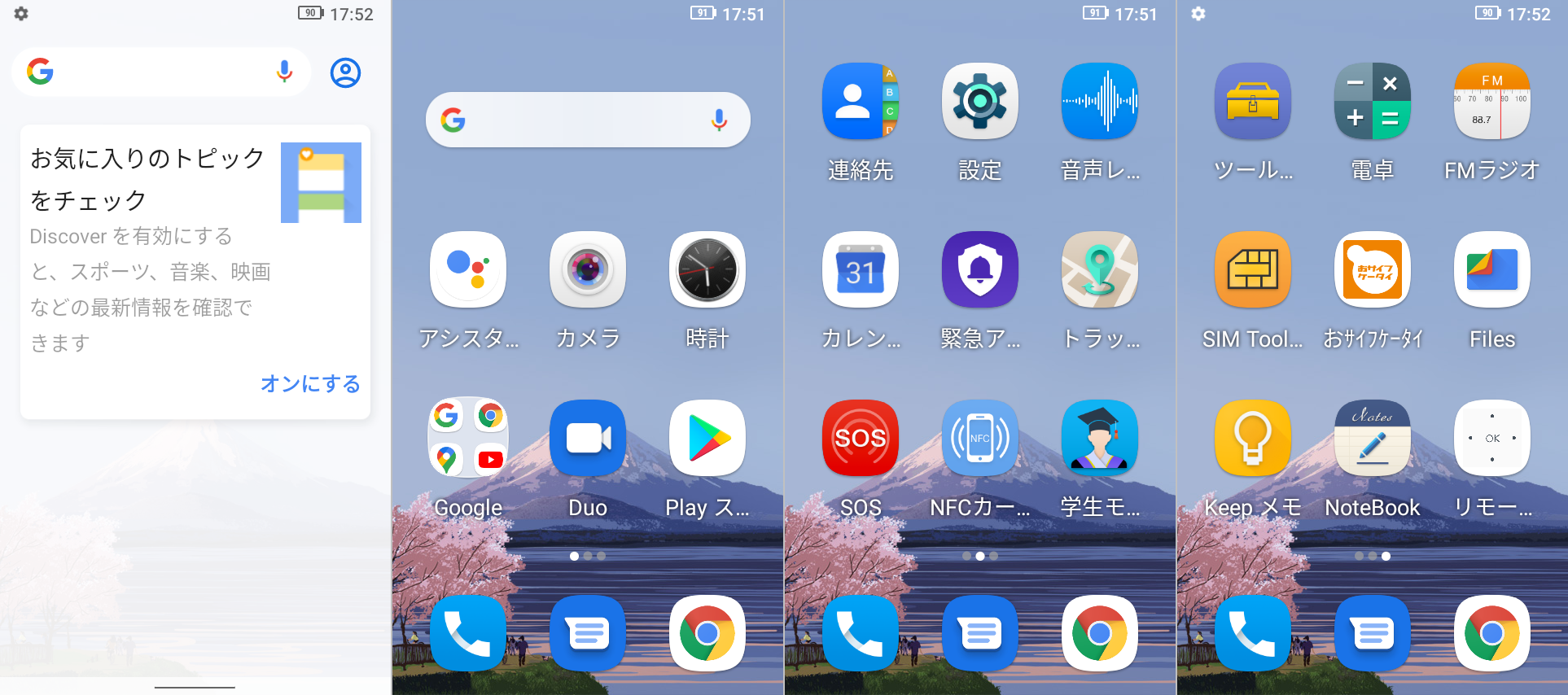 Rakuten Mini や Palm Phone のような特殊なホーム画面ではなく、割とフツーのホーム画面です。アプリドロワはなく、ホーム画面に全て並んでいます。左側に Google のフィードがあり、3面分にアプリが並びます。若干特殊なアプリがプリインされていますね・・・