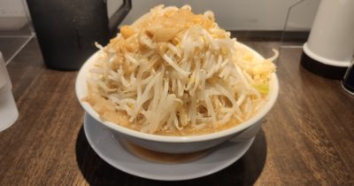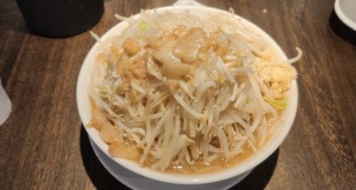 前回は麺300gのミニに野菜マシマシで、若干腹に余裕があったので、今回は小(麺400g)に野菜マシ。脂とニンニクは普通をチョイス。なかなかのビジュアルです。野菜マシマシにしなくて良かった・・・。