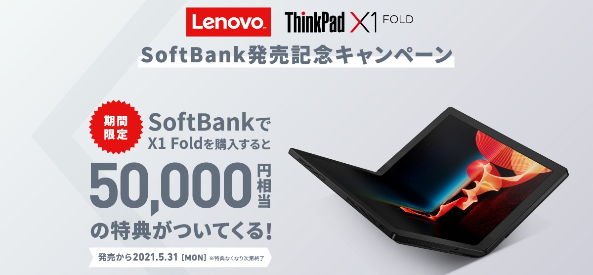 あと、モトローラは Lenovo 傘下ということからか、Softbank からは Lenovo のフォルダブル PC である、ThinkPad X1 Fold の 5G 対応版も取り扱いするようです。402,480円と、Softbank に支払うにしては高額過ぎる商品ですけど・・・。razr も X1 Fold も、Softbank ならトクするサポート+というサービスを利用することで、ほぼ半額の負担で購入できるというメリットがあるようです。とはいえ、このサービスは48回の割賦になって、2年後に端末を返却することで残りの24回分の支払いをしなくてよい・・・というものなので、本当にオトクかどうかは疑問ですけどねぇ。私は買い切りじゃないのは、ちょっと苦手・・・。