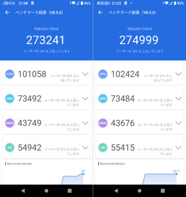 2回測定したところ、どちらも27万少々といったスコア。当然アヤシイ端末の10倍以上(笑)。オサイフ端末のライバルである Jelly 2 は17万少々だったので、Rakuten Hand の方がベンチマークスコアとしては圧勝というトコロ。