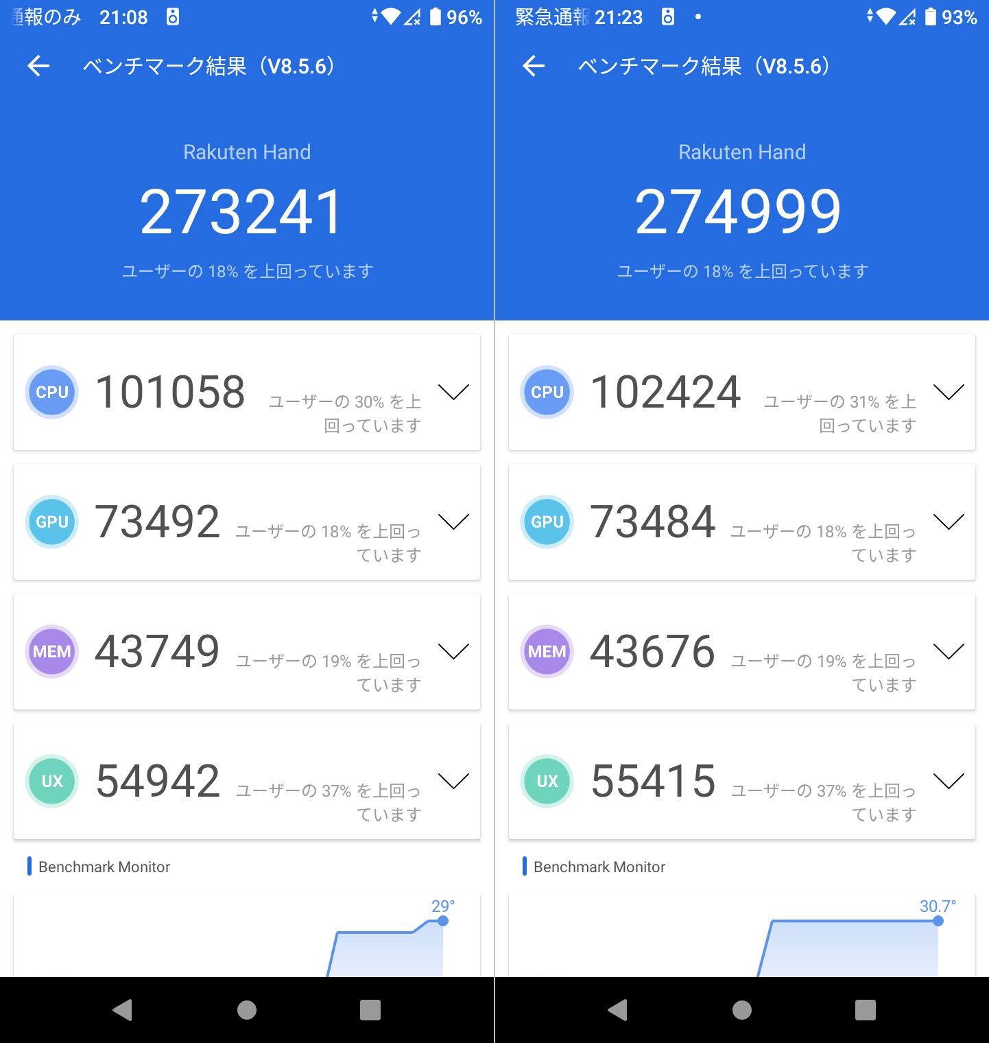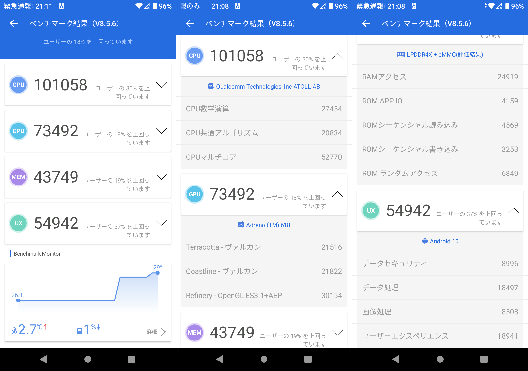 さすが、スナドラ 720G を搭載しているだけのことはありますな。1回目測定時の詳細はこんな感じです。測定していても、本体がそれほど熱くならなかったのも好印象。