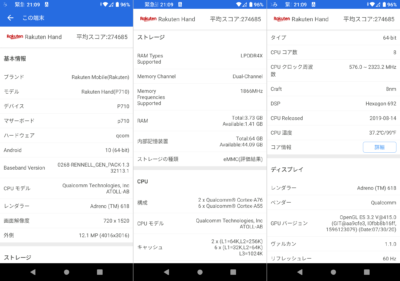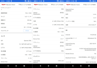 表示されるデバイス情報はこんな感じです。アヤシイ端末のような偽装はないと思います。画面解像度が控えめなところが効いているのかもしれませんが、ガルマックスさんのまとめで27万点くらいを見てみると・・・スナドラ835搭載の端末よりちょっと良いスコアといった感じですね。現役オサイフ端末な Xperia XZ1 Compact がスナドラ835なので、オサイフ端末メインになっても良さげ。