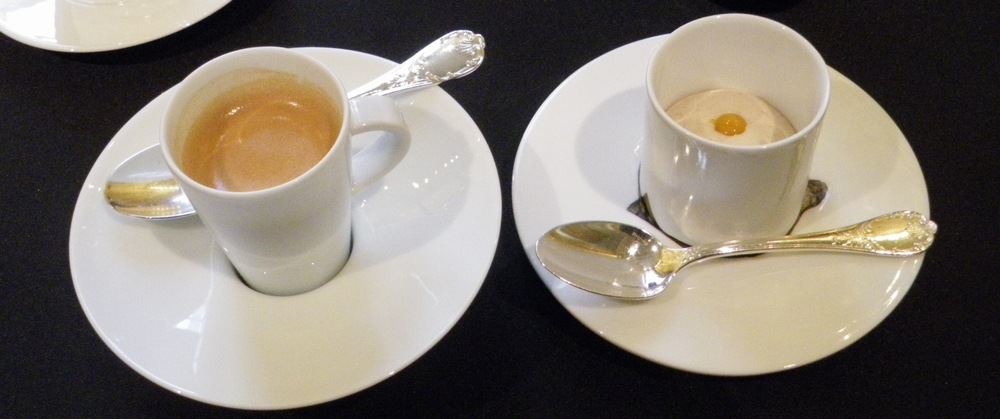 続いてカフェと第3弾となるミニャルディーズ。カプチーノは濃厚で超お好み。2杯も頂いてしまいました。ミニャルディーズは季節感たっぷりの栗のムースですが、底に敷き詰められたジュレは結構ブランデーが効いてて全体的に甘すぎずキリっとした後味。