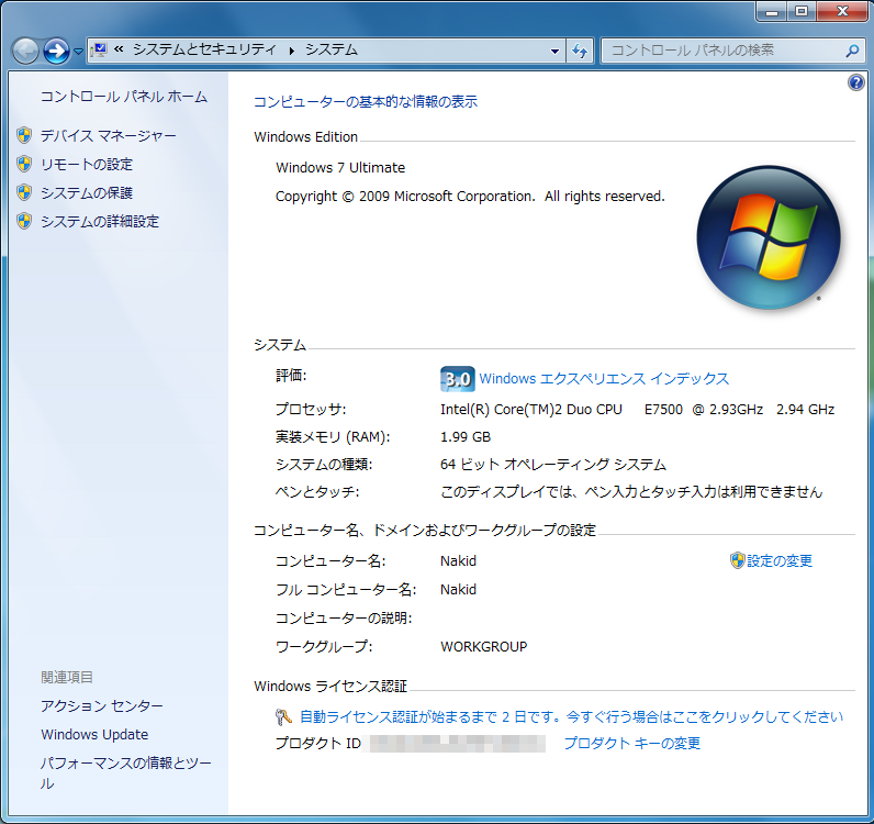 Windows エクスペリエンスインデックスをメインデスクトップと比較してみましよう。OS はいずれも Windows7 Ultimate x64 です。