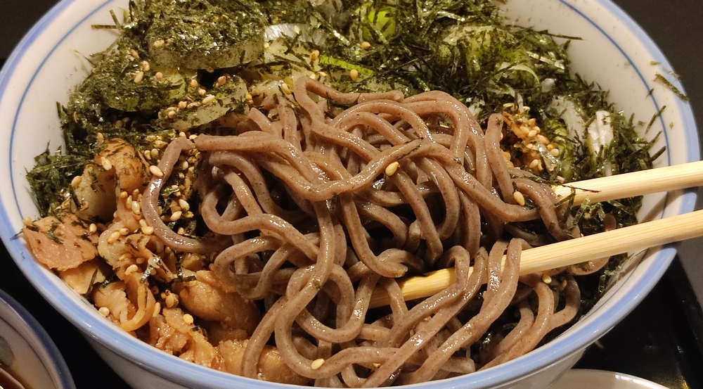 海苔の下にはネギがあったので、見た目ほど超大量ではありませんでした。蕎麦は結構太目でカタメなゴリゴリ系。田舎蕎麦みたいな感じ。