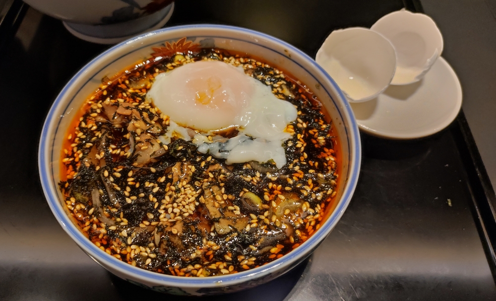 温泉玉子も付属しているので、途中で投入。若干マイルドになります。お肉は結構シッカリとあるので、軽く軽食って感じよりもちょいとヘビー。