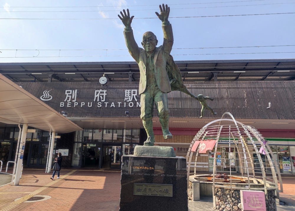 ちょっとだけ別府駅には立ち寄りました。油屋熊八の像がお出迎え・・・。小鬼がぶらさがってたりして、ちょっと面白いですなw