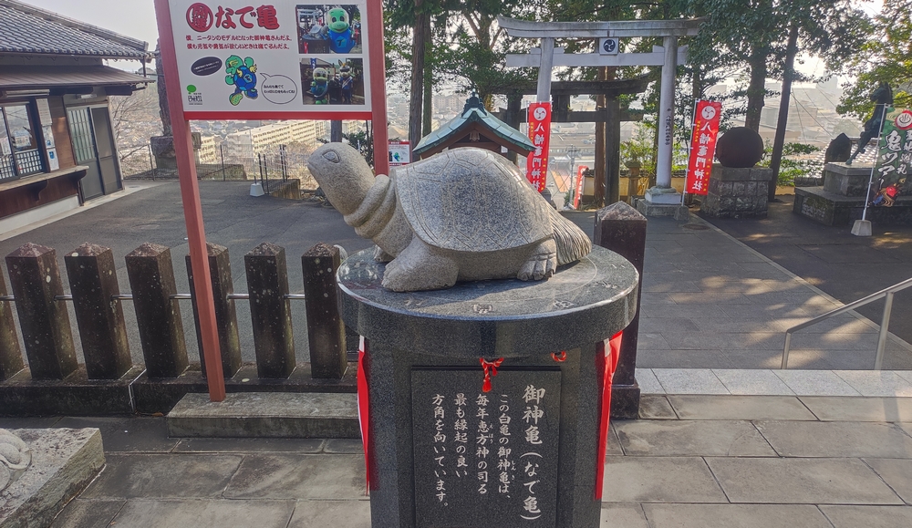 「鬼が造った九十九段の石段」といった伝説もあったりして、漫画の世界観と一致するところがありますな。ここからは街と海が一望できて、とても良い眺望です。