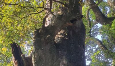 特定の場所から見上げると龍の頭に見えるという御神木。