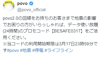 Twitter でリツーイトしましたけど、povo2.0 がデータ使い放題のプロモコードを発行していたことに感心しました。割とすぐにアナウンスされてて、事前にこうした緊急事態への施策として準備されていたんだろうな・・・と、企業としての姿勢と、結構太っ腹な施策に感動しました。未だに無課金で使い回線キープしているけど、こうした緊急時の用途としての魅力もあるなら、時折課金して継続して回線保持していこうっていうモチベーションになりました。今回は地震の影響でお困りじゃないのでこのプロモコードは使ってませんけど、時折やってる謎解きで配られるプロモコードはありがたく利用しております。