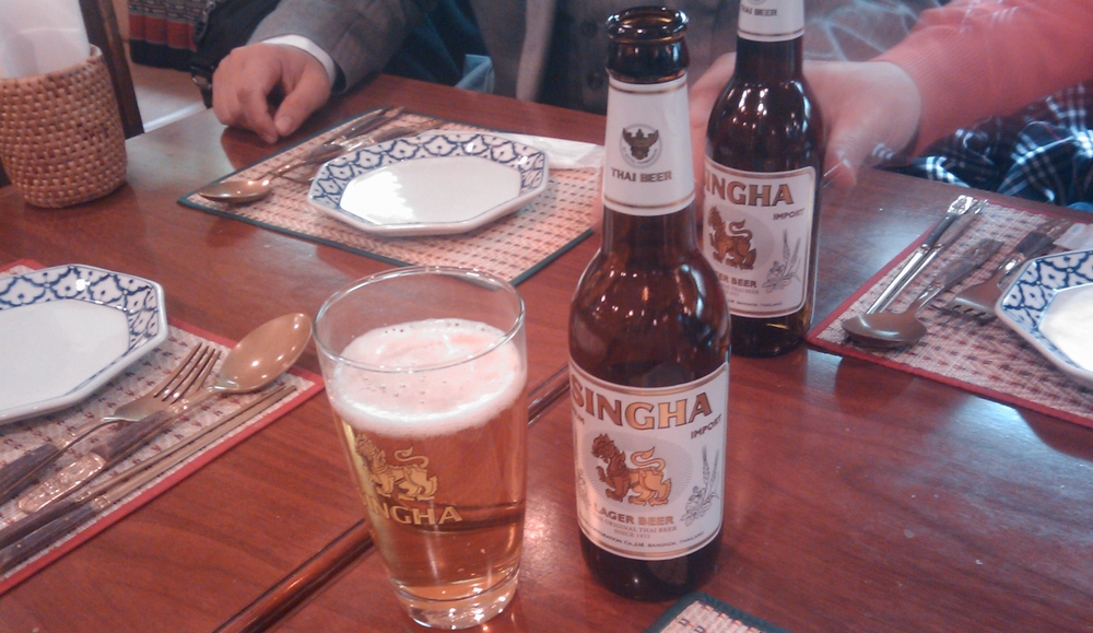 仕事上がりの乾杯は、参加者も全員揃わぬままタイビールなシンハーで乾杯。