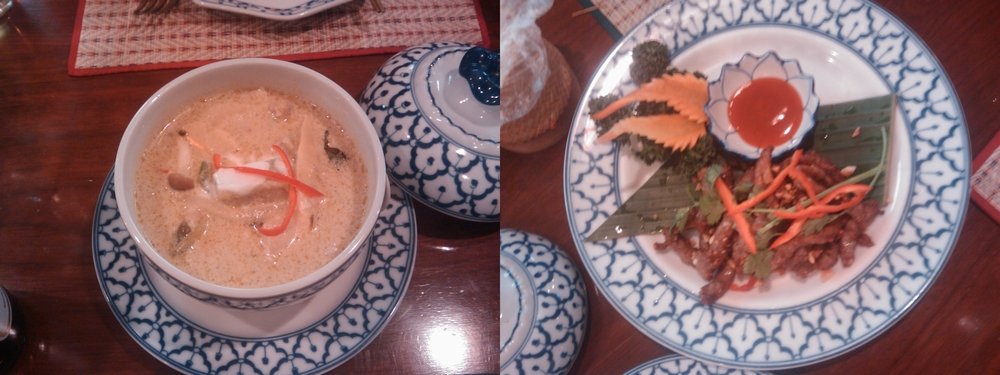 さらに「ゲンキョウワン」鶏肉のグリーンカレー。管理人はココナッツミルク入りの食べ物は後日お腹を下すのですが、美味しいのでしっかりいただきました♪。「カオ」というジャスミンライスも頼みました。右側は「ヌァ ナムトック」タイ風牛肉のスパイシーサラダ。これもソースと合わせるとお酒のツマミに最適です。