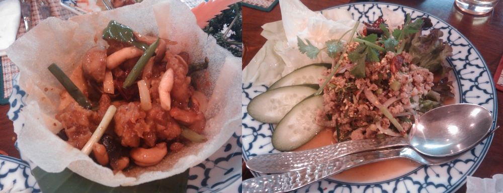 そろそろ終盤な「ヤム タクライ」鶏肉とカシューナッツのサラダ。そして「ラーブ ムー」タイ風辛口挽き肉サラダ。この辺まで来ると、写真は撮ったけど食べてないような・・・