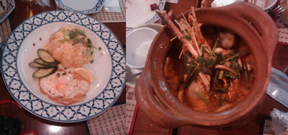 終盤になぜかご飯モノ「ムー カラッパオ ラードカオ カイダオ」タイの豚挽き肉ライスの目玉焼き玉子のせ。右側はタイ料理の代表格「トム ヤム クン」車海老の辛くて酸っぱいスープ。海老のダシが濃厚で非常に美味でした。