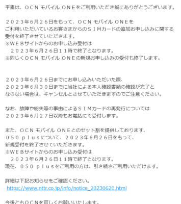 現在サブサブ回線として利用しているONCモバイルONEの残ギガ確認のために導入しているOCNアプリの通知で「新規申し込み終了」というのがやってきました。内容はメールでもやってきたような上記のような感じ。なぜ終了するのか、既存のプランはどうなるのかが全く記載されてなくて「???」となる感じ。リンク先のプレスリリースには書いてある(20日時点で書いてあったかは謎)けど。