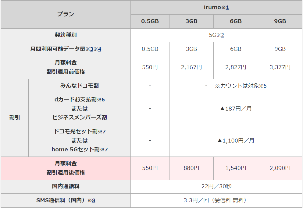 そして問題は irumo。これは既存のOCNモバイルONEをベースにしたものと想像できるのですが、既存のものと比べると色々と改悪されている感じが否めません。一応低額な550円/月プランは残ったものの、3GB/6GB/9GB のプランは990円/1320円/1760円から大幅値上げ。一応光回線やカードとのセット割を入れると近い感じの値段になるように設計されてるけど・・ハッキリ言って、そういうシバリが嫌いな私には検討対象から除外となりますな。
