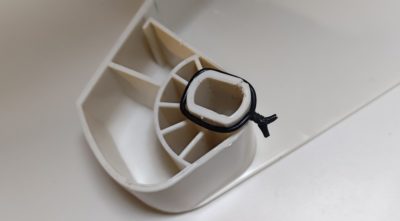 なるほど、イイ感じにフィットします。ちょっとだけ緩い感じもするので、隙間に爪楊枝を差し込んで、はみ出す部分をカットしてみました。