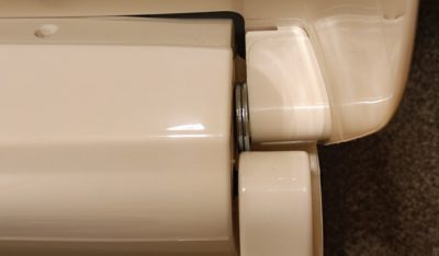 Panasonic の CH931S というモデルで、便座のフタは途中まで降ろすととユックリと閉まるような速度緩衝機能が付いているんですが・・・それが効かずに、バタンと閉じるようになってしまいました。パなの FAQ にこんなものがあったので、フタを外してみると・・・