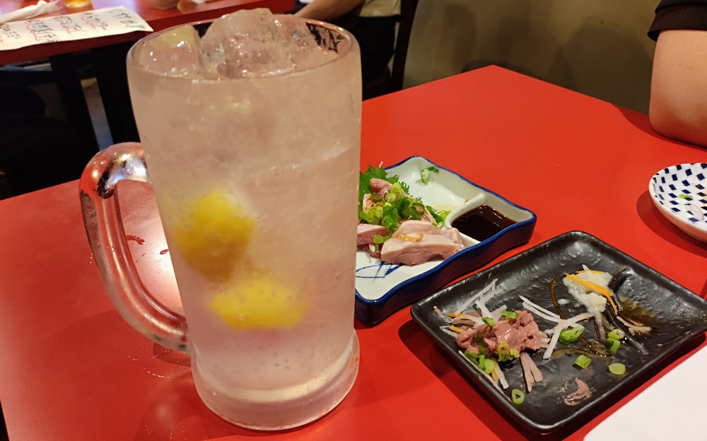ハッピーアワーなビールを2杯飲んだ後は、巨大なメガレモンサワーで。コレ、ナカミだけを格安で追加できるので、上手に使うとかなり低コストでタップリ飲めます。