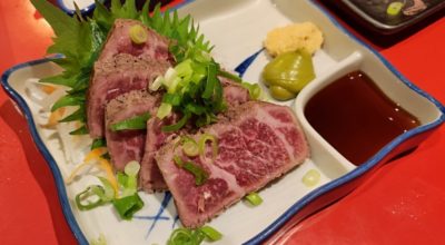 日替わりメニューな牛のたたきも旨味凝縮で美味しかったです。ワサビが残念な感じだったんですよね・・・こういうのは、本山葵で戴きたい。