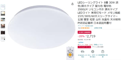 一応 LED シーリングライトが安いのがいくつか出ていたので検討したんですが・・・よくよく調べると、最近の中華製のシーリングライトの多くは、リモコンが Bluetooth になってますね。スマホアプリからも操作できるし、リモコンを照明に向けなくても良いというメリットはあります。しかし、我が家の場合、Alexa や Google Home と連携させて音声操作するようにしているので、直接 WiFi 対応していない場合はリモコンが赤外線である必要があるのです。アプリ対応と書かれているモノは対象外で、記載がないヤツも赤外線かどうか不明な商品も多く、手を出しにくい・・・というわけで、悩んだ末に手を出せず。・・・もしかしたら、セール終了間際にポチるかも⁉