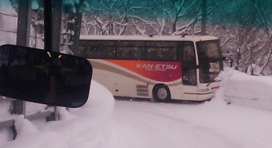 帰りがけ、スキー場を出てすぐの所で事故現場に遭遇。私の乗っていたバスもしばらく足止めとなりました。上の写真のバスに向かって、車高を高くした改造デリカが左カーブに失敗して、対向のバスの運転席付近に突っ込んだようです。バスの運転席はガラスが割れており、バスは雪壁に刺さっていました・・・