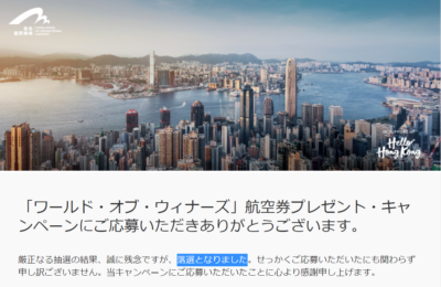 Posted in Travel, ひとりごと 残念・・・落選。 Author: 管理人 Published Date: 2023/07/14 Leave a Comment on 残念・・・落選。 香港国際空港が実施していた、全世界で総計50万枚の往復航空券プレゼントキャンペーン。香港エクスプレスは無理ゲーで、香港航空は名古屋発なので止めておき、抽選なキャセイにエントリーだけしておきました。 そんなキャセイの抽選結果がメールで届いておりました。まぁ、予想通り見事に落選。当分香港に行くことはないかしらねぇ・・・。 最近は色々と抽選販売なチケットに当選し続けていたので、もしや当選しちゃうかも・・・なんて甘いこと考えてましたが、全然ダメでした(笑)。 Author: 管理人