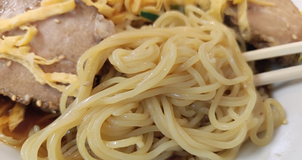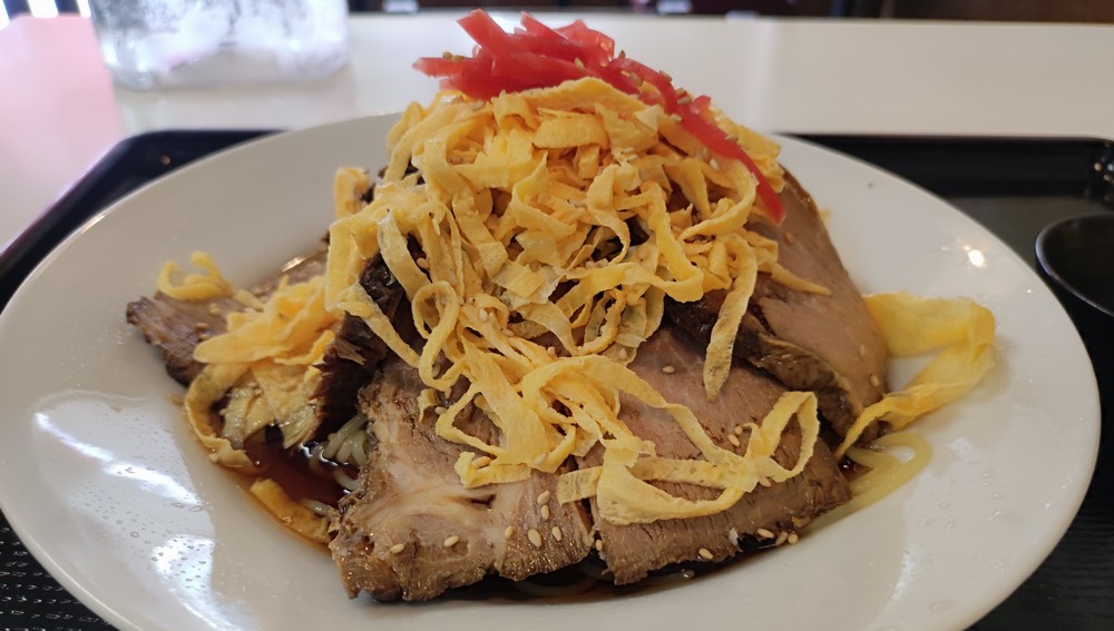 麺が見えない程に大き目な4枚のチャーシューで覆われています。紅生姜と錦糸卵は見えておりますが、チャーシューの下にはキュウリも隠れております。