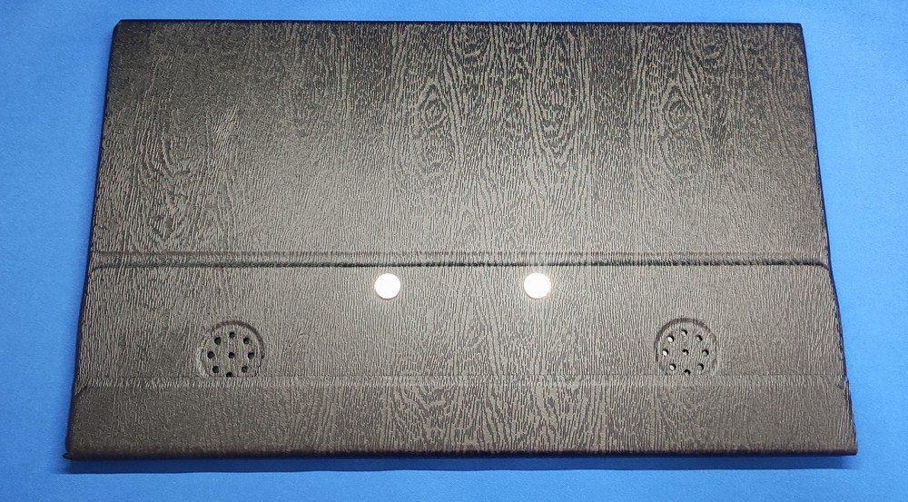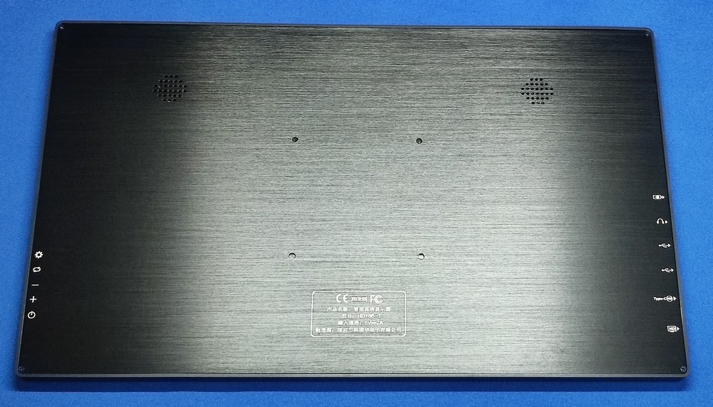 本体背面を見ると・・・上の方にスピーカーっぽいものが2つ見えます。また、4つのネジ穴があって、これが VESA 75mm として使えそう。2つのネジ穴をケース装着にも利用している感じです。背面に印字されたところを見て初めて、型番が HD156-T であり、5V/2A で動作するといったことを知りました(爆)。