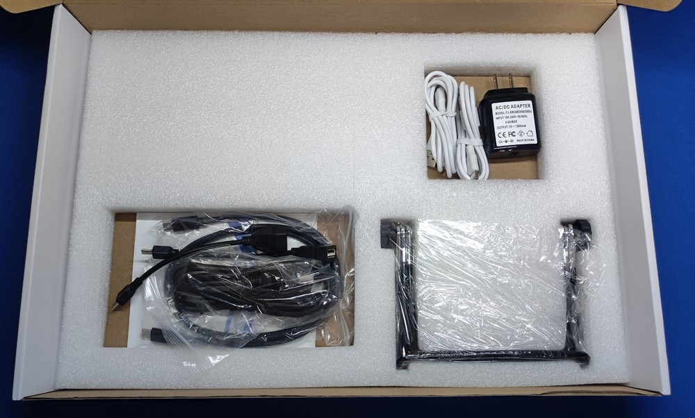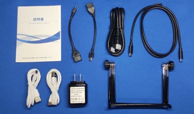 説明書は日本語のものが1枚。MicroUSB から Type-A のメスになってる、いわゆる OTG ケーブルが2本、片方が MiniHDMI になっている HDMI ケーブルが1本、Type-C to Type-C な USB ケーブル、白いケーブルの束2つは、Type-A to Type-C な USB ケーブル。USB 給電可能な電源アダプター1つ、本体を立てかけることができそうな折り畳みスタンド・・・が同梱されていました。必要な周辺機器は全て付属させておりますといった感じです。