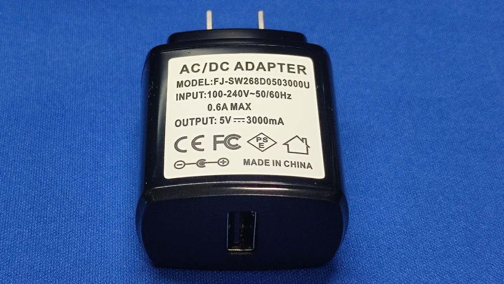 付属の電源アダプターは 5V/3A みたいです。一応ラベルには PSE マークは付いてるけど・・・一番下の行に書かれた極性を示す記号は、USB じゃなくて DC プラグのモノですよね。アヤシイですなぁ。記載のモデル名でググると、別な商品に付属していたようなページが少々ヒットします。まぁ、何かの使いまわしなのでしょう。