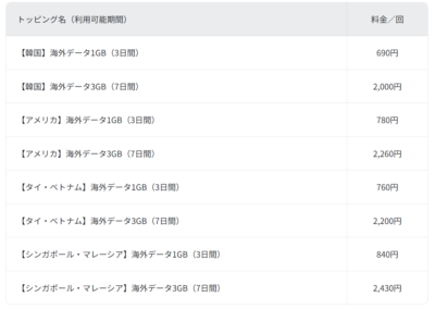 料金はエリアによって異なりますが、3GB/7日間だと、安いトコロ(韓国)で2,000円、タイ・ベトナムで2,200円、アメリカで2,260円。その他多くの国(レギュラートッピング地域)で4,280円。通信費が安いと思われる香港や台湾でもレギュラーなのは・・・ちょっと謎ですな。今後、エリアトッピングになる国が増えるといいなぁ。