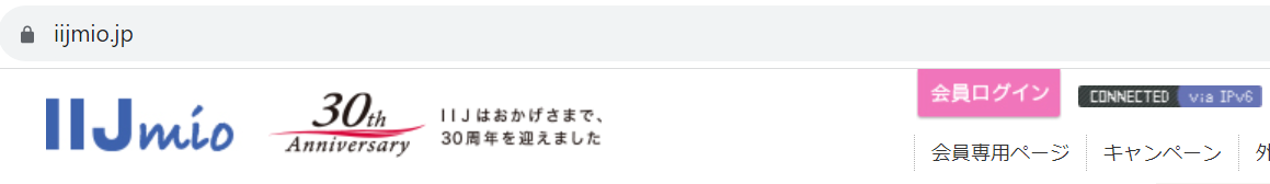 IIJmio のトップページにアクセスすると、上部に接続方式が表示されるというので見てみると・・・via IPv6 となっています。まぁ、PPPoE で IPv6 接続できているってことですかね。この PPPoE だと、混雑する時間帯で IPv4 サイトへのアクセスが遅くなる可能性があるので、IPoE に設定したいところですが・・・