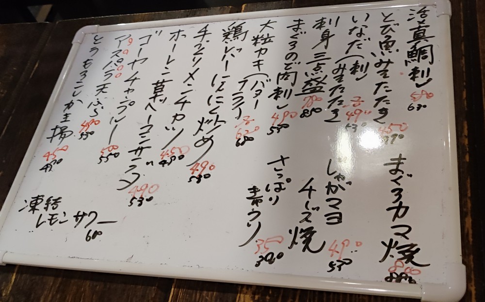 この日のオススメメニュー。開店時の少な目ボード。この後もう少し追加されたバージョンにアップデートされました。