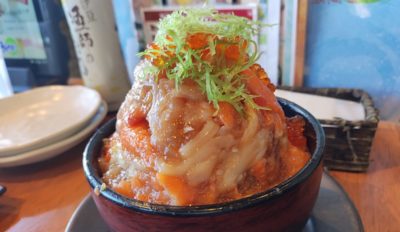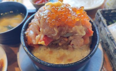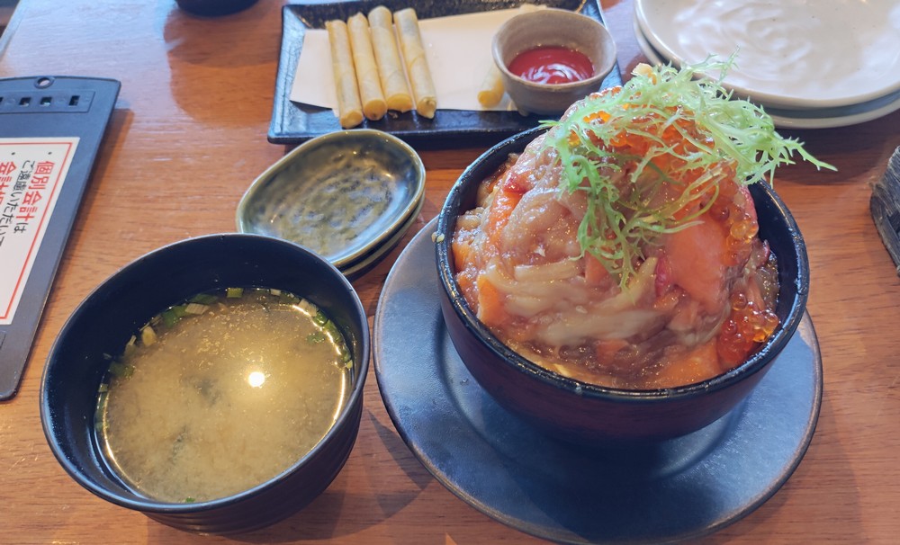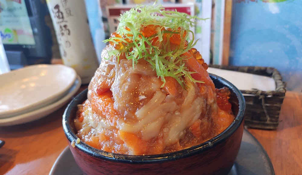 ご飯の熱で魚が温まらないように、取り皿に退避させつつ食べました。ご飯は普通サイズにすると、丼のフチの高さまでミッチリと乗っているそうな。そんなに食べたら腹いっぱいになってしまいますが、ご飯が少な目だと、お魚とのバランスがちょっと悪い。