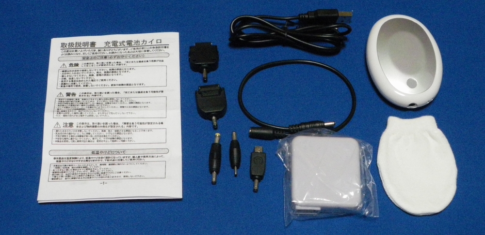 コヤツは安い上に、色々な Gadget への給電もできるアダプタが豊富に入っています。充電は USB 経由で行い、強モードで4時間、弱モードで7時間使えます。強モードだと、結構暖かいですし、やはり手軽に ON/OFF できるのは便利です。