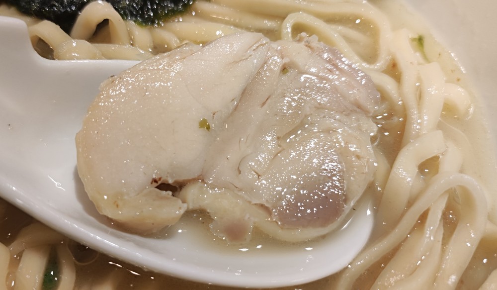 海苔の後ろに鶏チャーシューが1切れ隠れていました。ずいぶん小ぶりではありましたが、コレは味がシッカリしてるし、柔らかくてジューシーで良かったですかな。