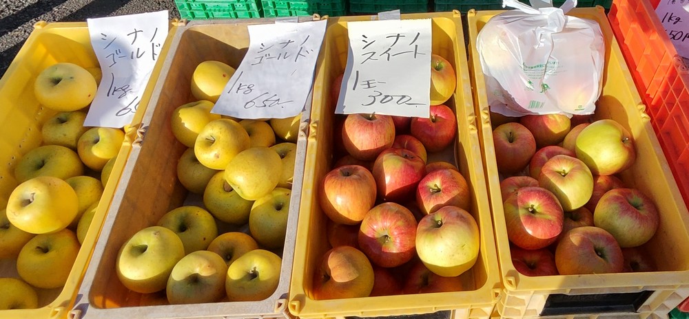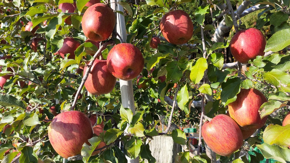 この農園の周囲には沢山の林檎の木があります。シナノスイートを試食させていただきましたが、甘くて美味しかったです。