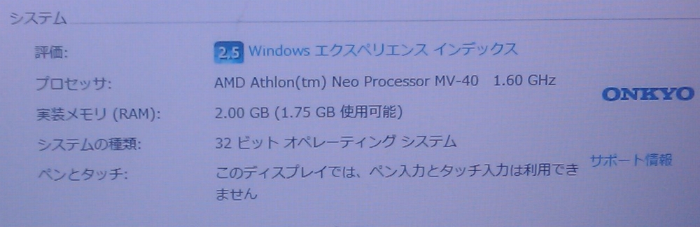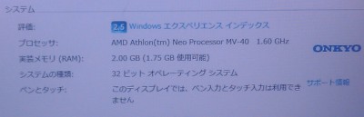 CPU は Atom じゃなくて Athlon Neo。1.6GHz だけど、Hyper Threading でもなければ Dual Core でもないので、パフォーマンスは期待できませんが、ネットやちょっとした文書作成程度なら十分かもしれません。意外にも Windows7 もストレス少な目で動いていたように思います。
