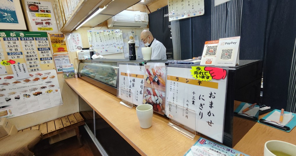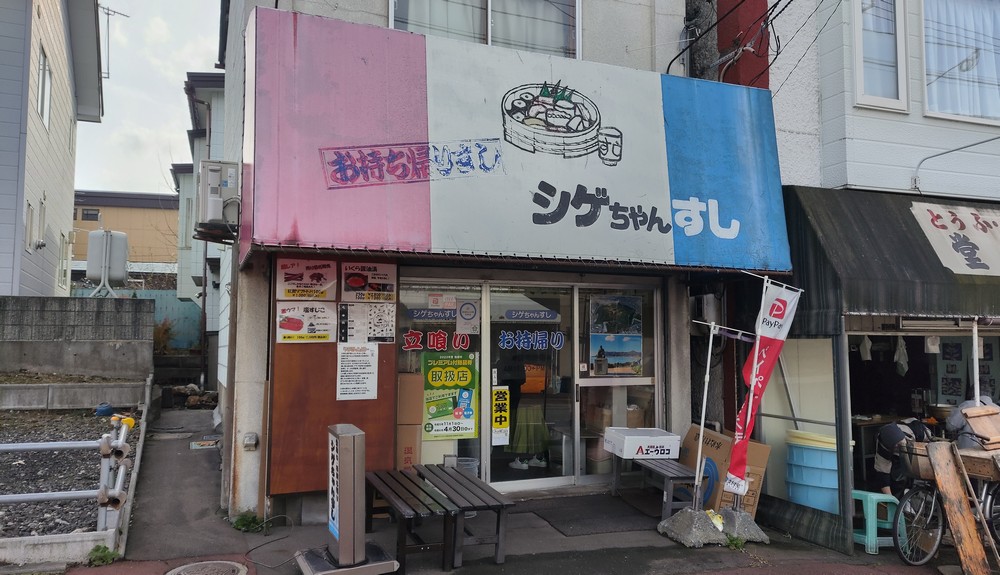 ちょっと歩いたところにあるシゲちゃんすしにやってきました。テイクアウトのお寿司がメインなお店らしいのですが、カウンターでの立ち喰いもできる高コスパと名高い有名店らしい。