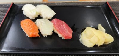 1巡目な5貫が並びました。店主さんがとってもリズミカルに握っているのを見ながら待つ時間も楽しいです。シャリは少し多めでシッカリ目なのは、テイクアウト用の寿司だと思えば納得。ネタは新鮮で、ボリューム感が程よくあります。
