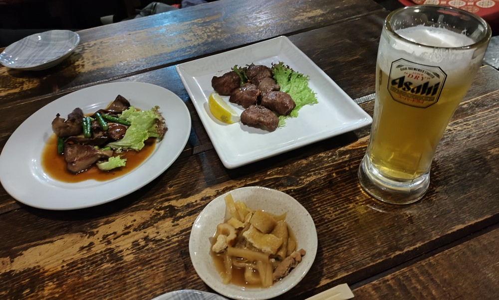 まずはビールで乾杯。オツマミはハツにんにくの芽炒めと豚ホホ肉塩焼き。ポテサラを頼んだけど忘れられてたのはご愛敬♪