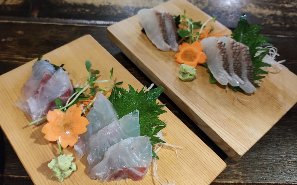 お鍋を食べたらお刺身。奥が真鯛、手前が黒鯛。黒鯛が圧倒的に旨味凝縮で美味しい!!