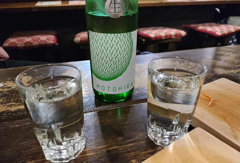 というわけで日本酒モードへ。この日はメニューにない特別な1本。4合瓶ですが1本買取で2人で堪能です。MOTOHIRA という名前と、このラベルのデザイン・・・見覚えがあります。11月の日本酒会でM沢さんが持ち込んだものと同じ酒造のヤツですな。日本酒会の VINTAGE 2020 はキレがあるサッパリ系でしたが、今回の元平 WHITE GREEN はとってもフルーティーな甘みと香り。だけども後味が超スッキリという不思議な味覚。白ワインのような感じもあり、お魚には良く合いますな。