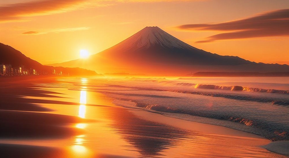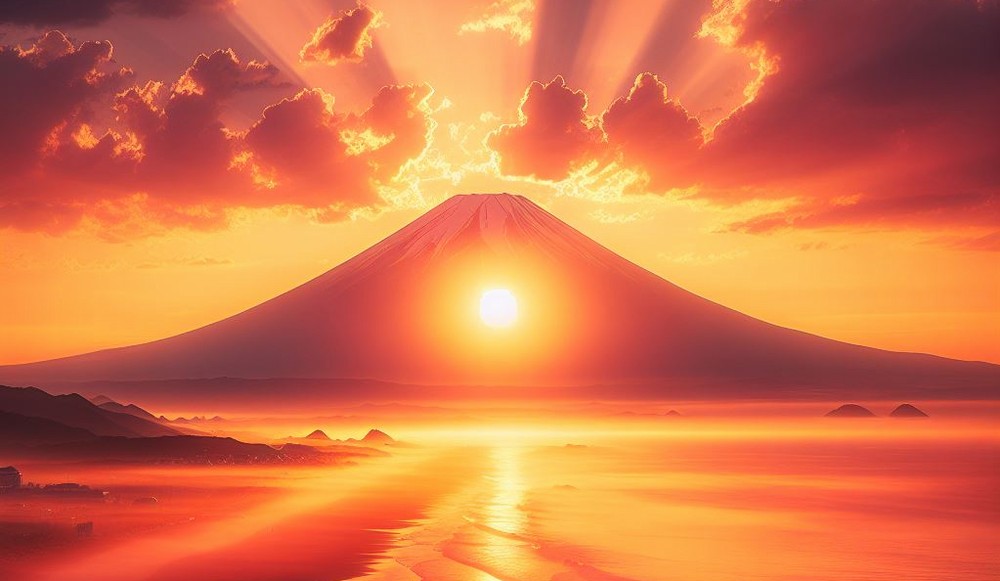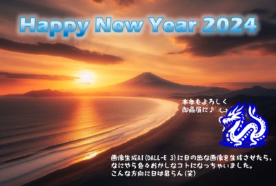 そんな年賀状のデザインですが、2023年は生成系 AI が流行ったということで、テキトーなプロンプト入力して富士山と初日の出っぽい画像を生成させてみました。確かに私が普段見る海からの富士山はこの方向で合っていますが、富士山を西方向に臨むので・・・日の出は逆方向ですよね。どちらかというと、夕日な感じになってしまいましたが、AI 的には日の出らしい(笑)。